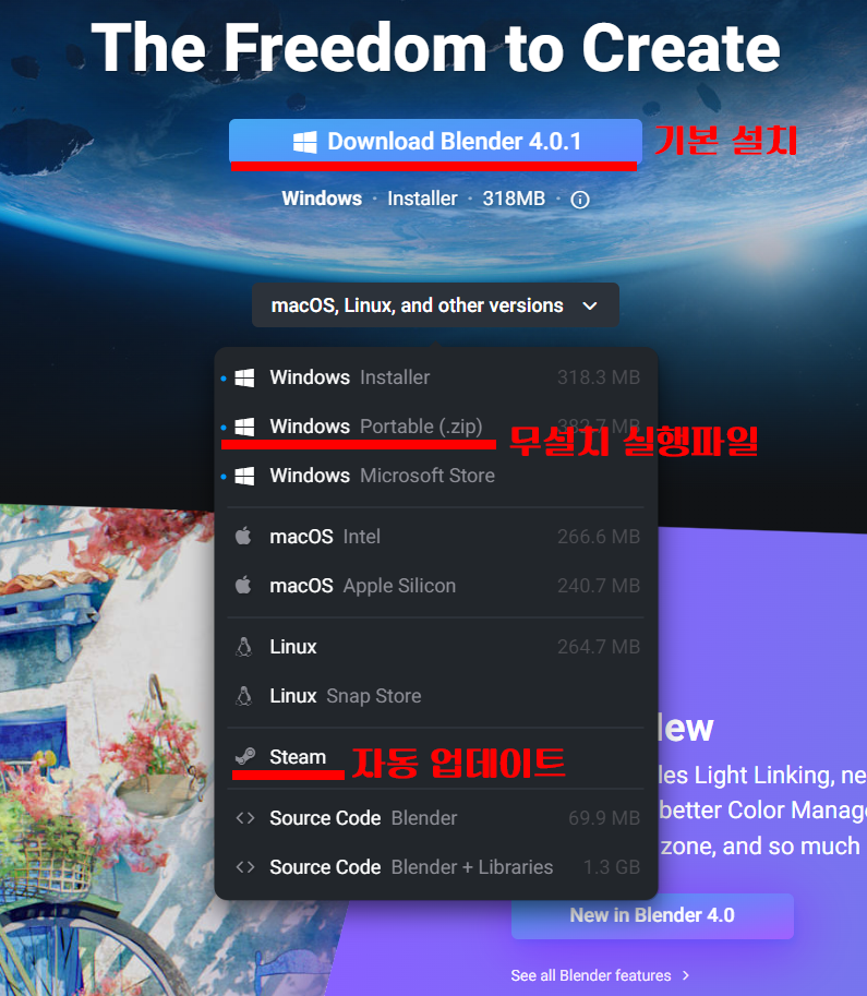 맥을 사용하시거나, 블랜더 자동 업데이트를 원하시면 하단에 별도로 다운로드할 수 있는 창이 나타납니다.